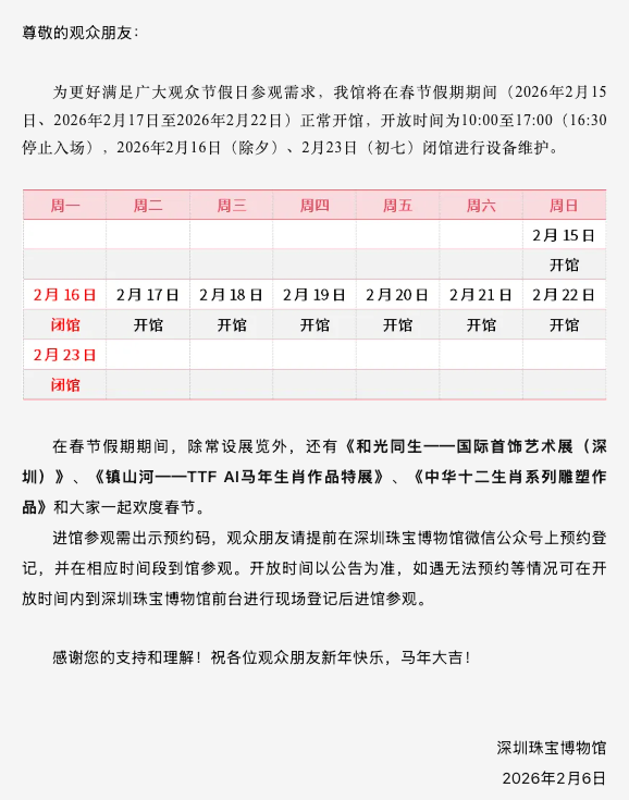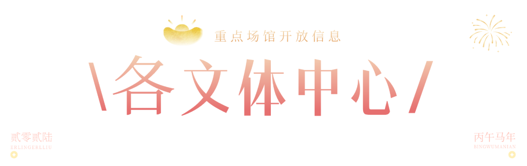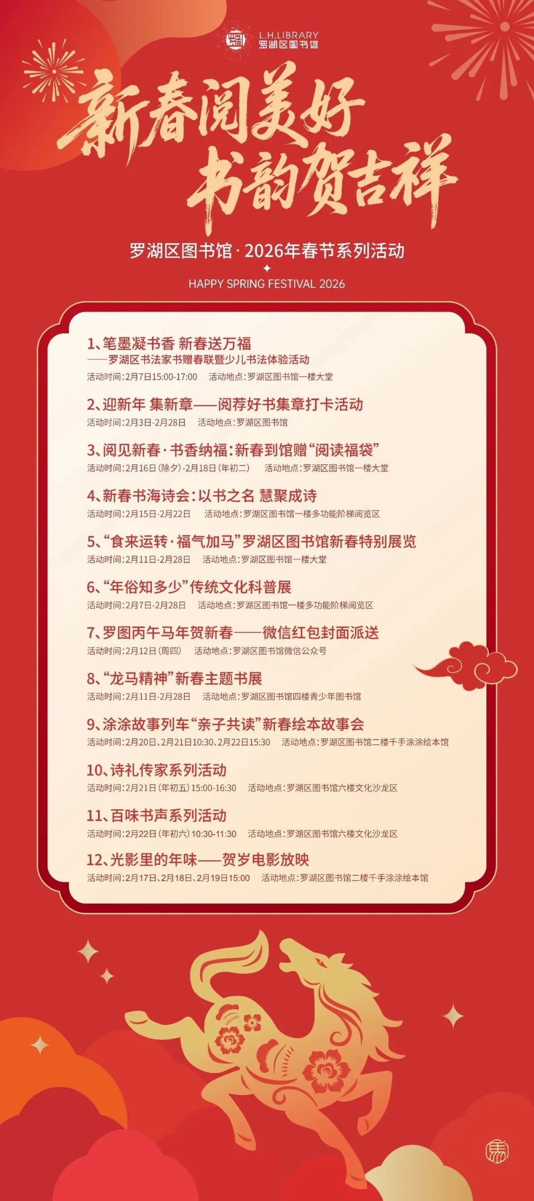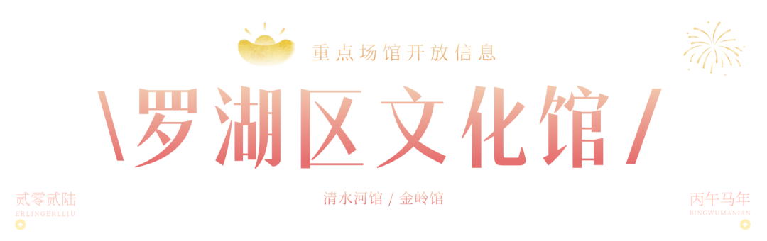 为丰富市民群众春节假期精神文化生活,满足大家节日期间文化活动需求,罗湖区文化馆清水河馆2026年春节假期(2月15日 —2月23日)正常对外开放,具体开放时间:每日8:00—22:00。请市民朋友合理安排出行时间,有序入场,度过一个欢乐、祥和、充实的新春佳节。