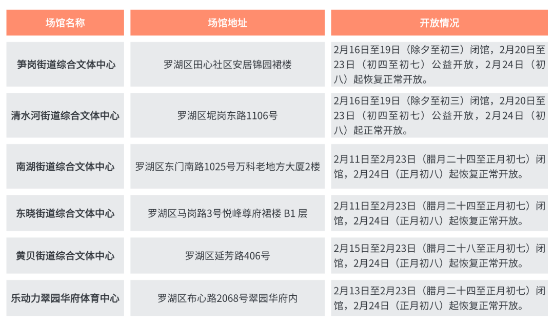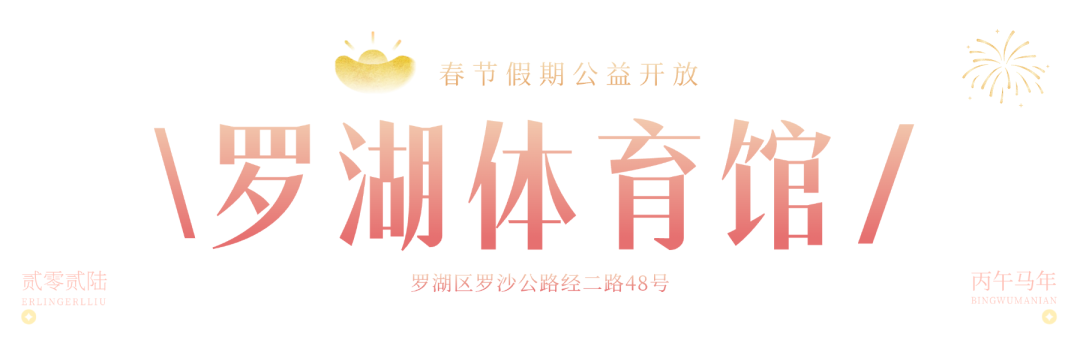 预约方式:每日08:00开放预约,通过“罗湖文体通”或“i深圳”体育场馆一键预约平台搜索。【罗湖体育馆(公益开放)】线上预约,公益开放时段不接受线下预订,场地有限,约完即止。2月20日(初四)至2月23日(初七)营业时间:10:00-18:00 ,营业期间正常收费。