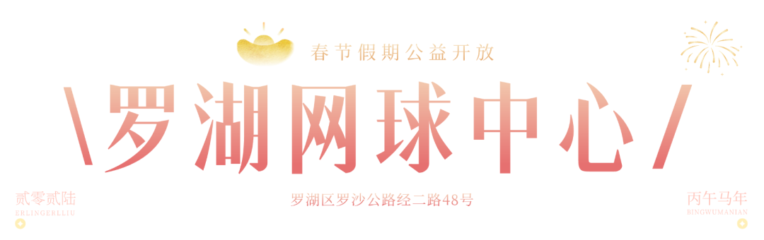 预约方式:每日07:00开放预约(需提前1天预约),通过“罗湖文体通”或“i深圳”体育场馆一键预约平台搜索。【罗湖网球中心(公益开放)】线上预约,公益开放时段不接受线下预订,场地有限,约完即止。2月20日(初四)至2月23日(初七)营业时间:10:00-18:00 ,营业期间正常收费。